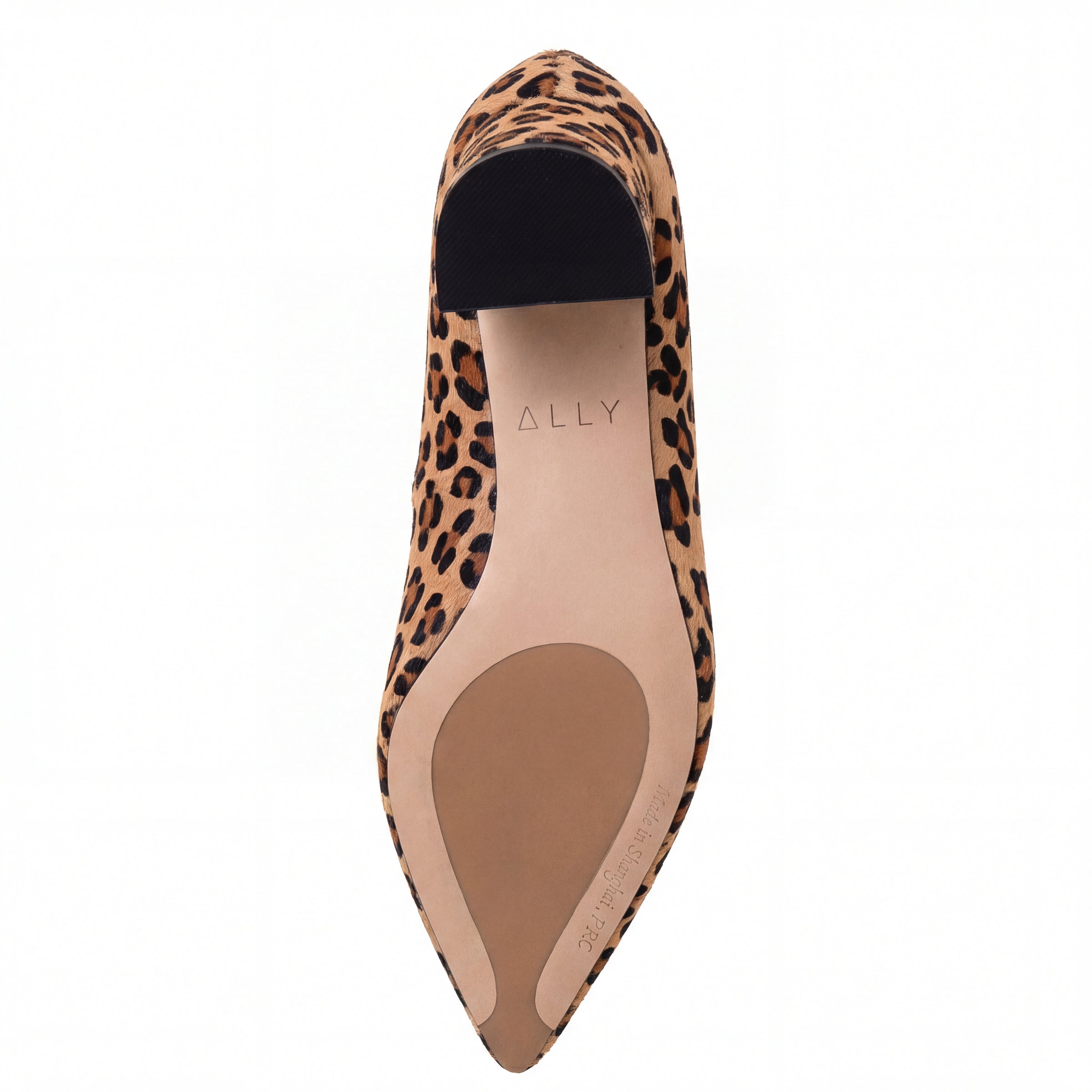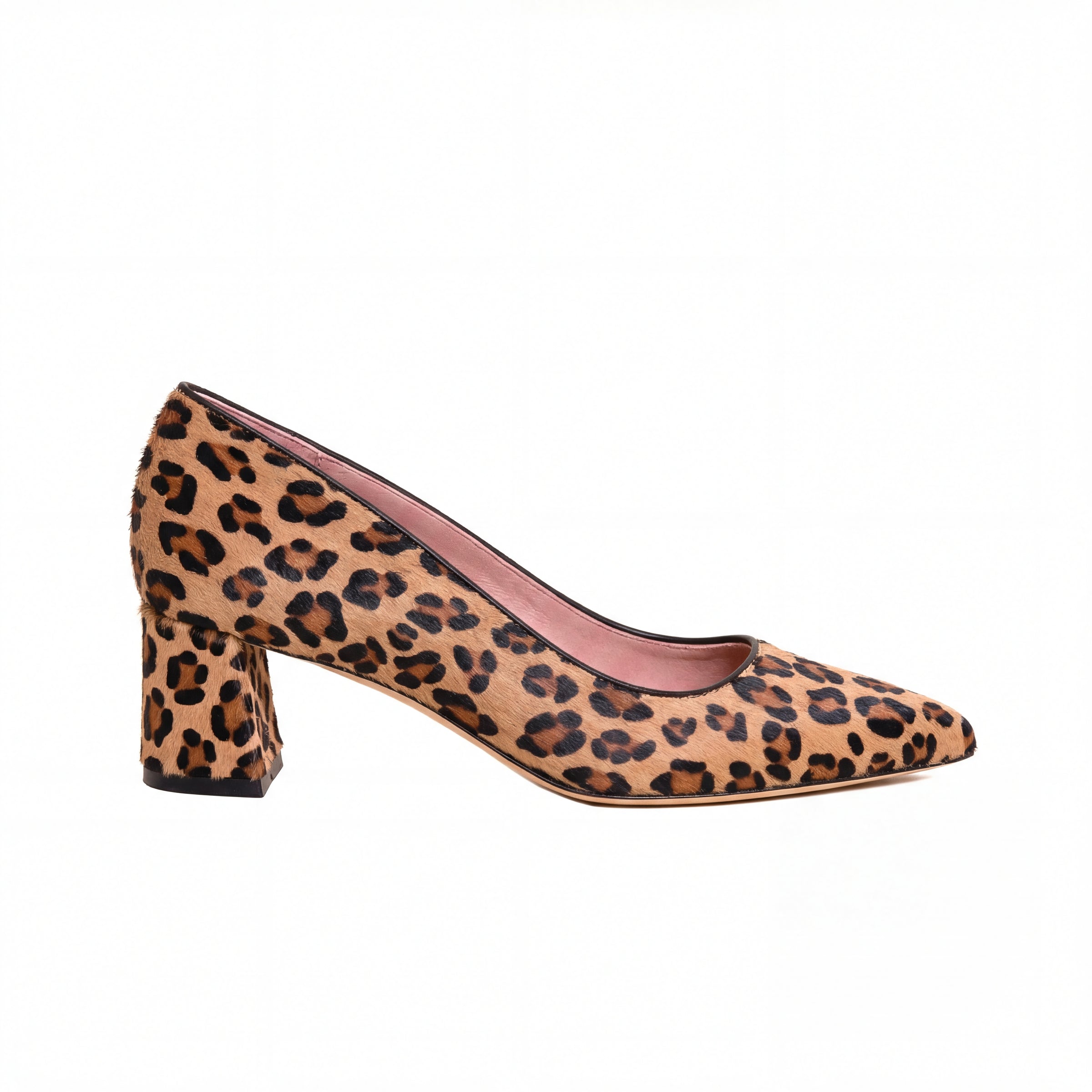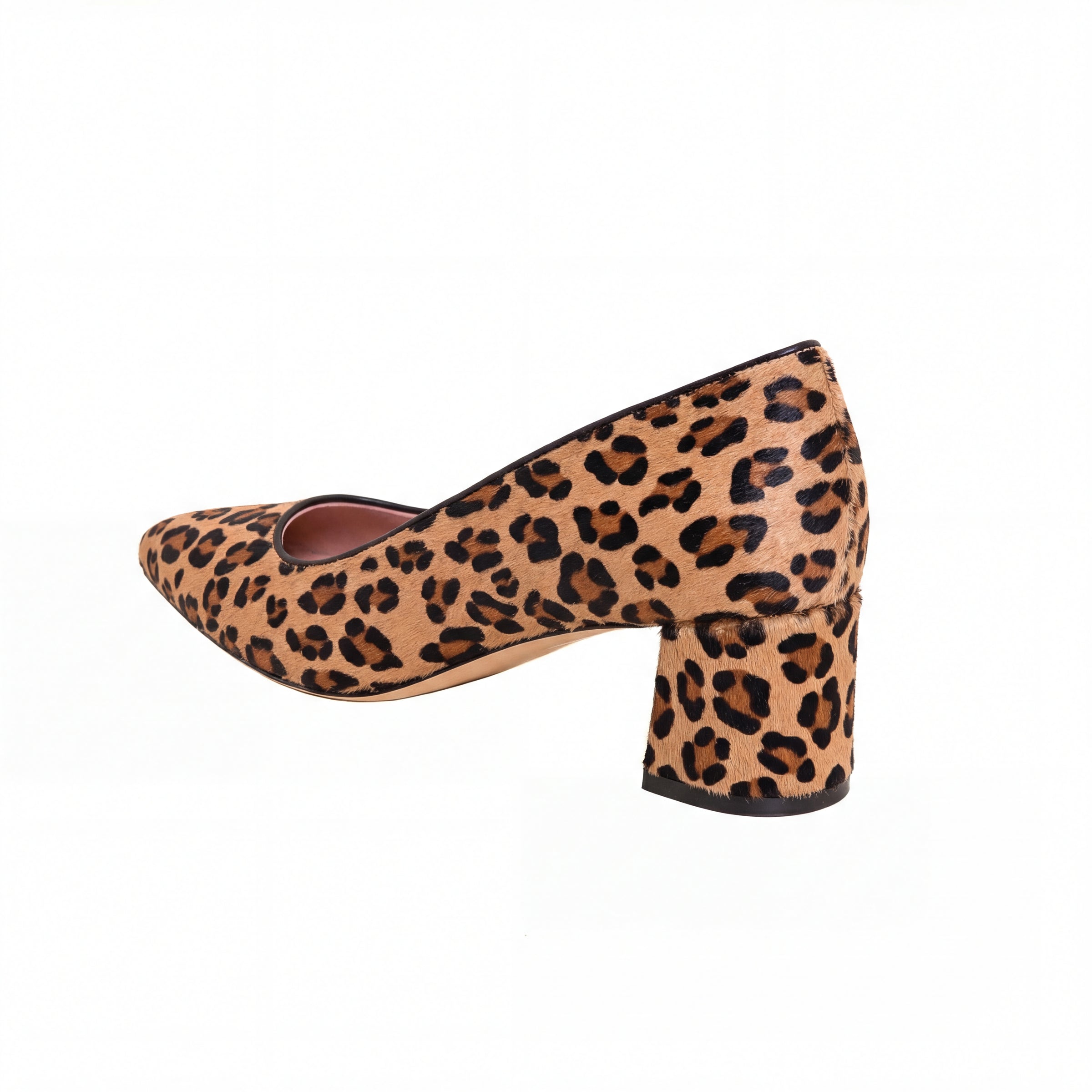 - Leopard print pony hair upper, Italian leather sole, suede lining