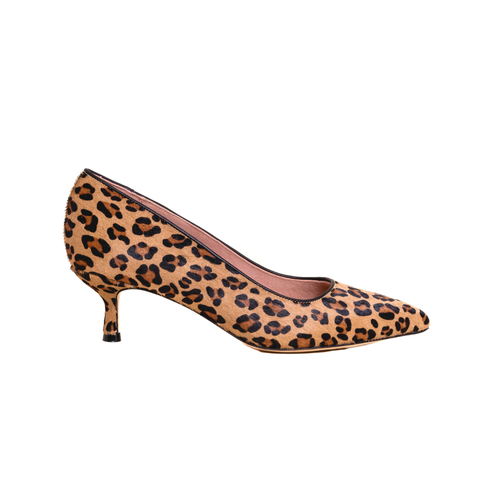 - Leopard print pony hair upper, Italian leather sole, suede lining